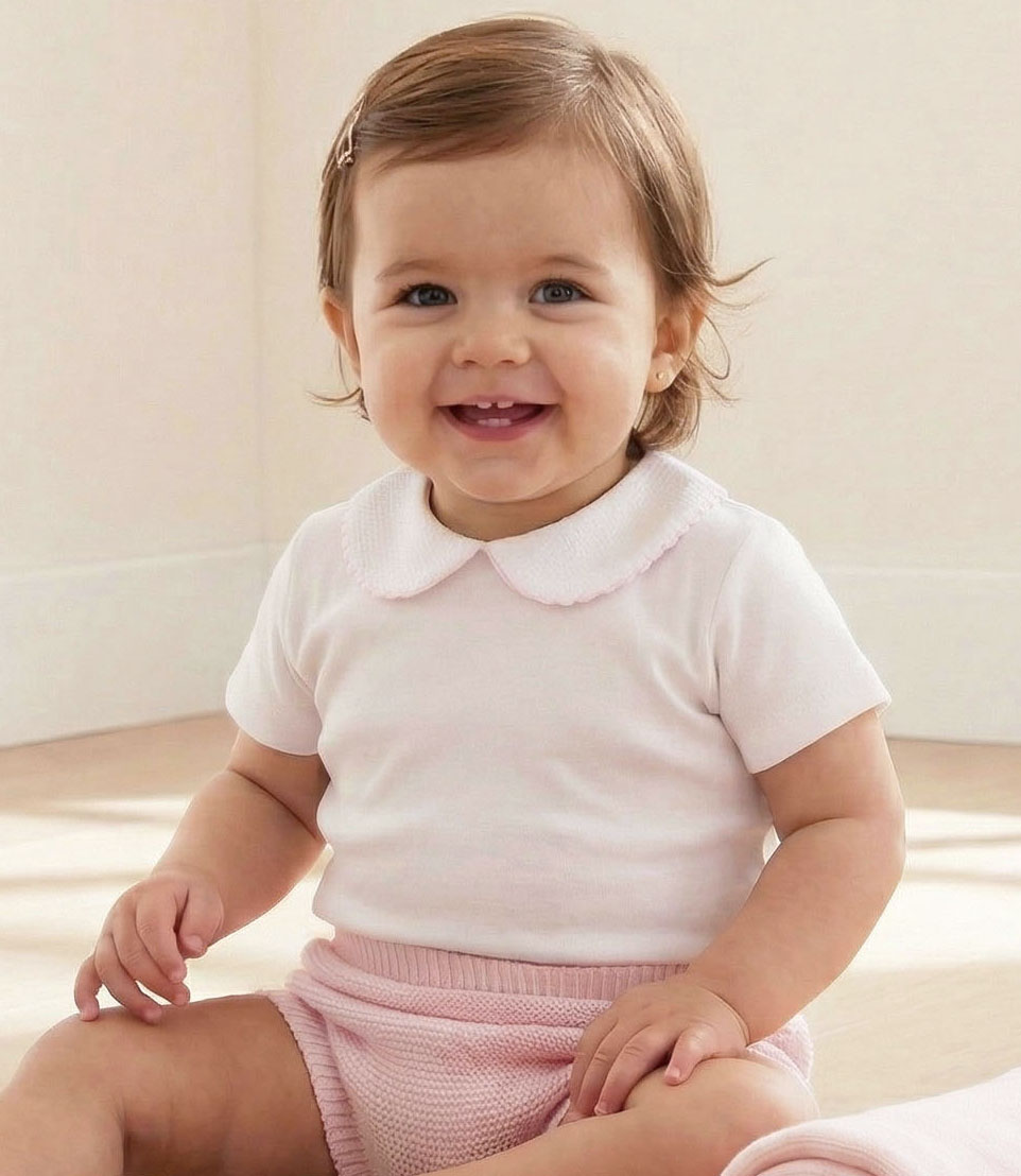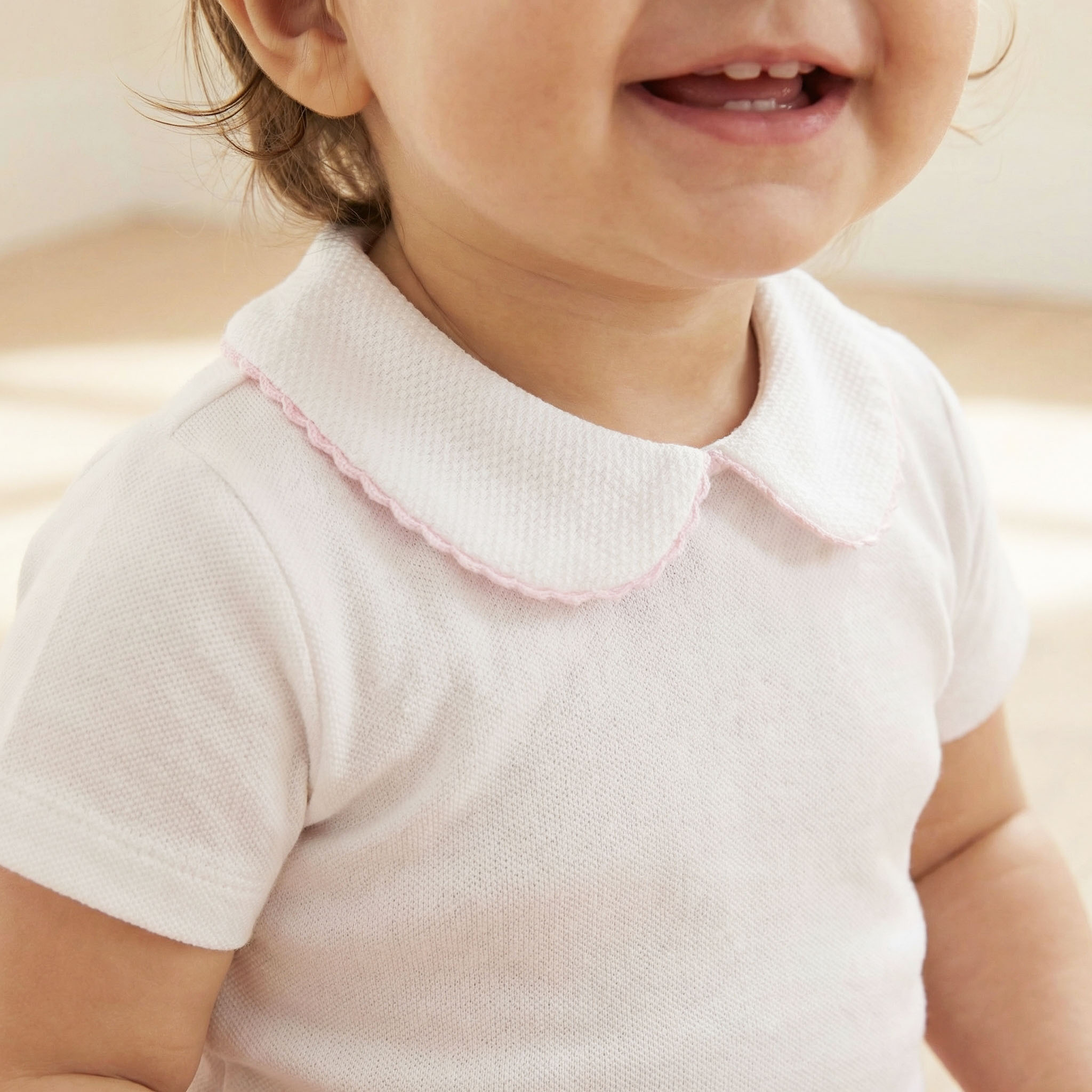 Short sleeve piqué bodysuit Peter Pan collar with pink stitch