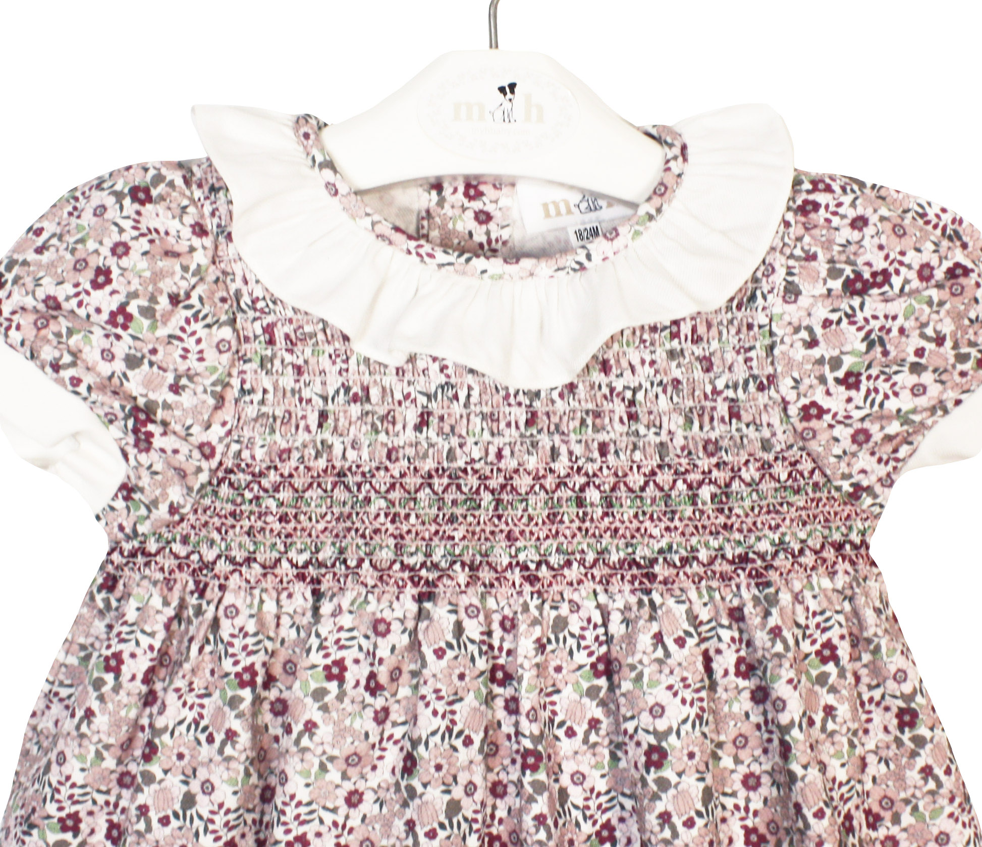 Flavia dress burgundy and pink flowers print. With diaper cover up to 24m. Made in Spain by m&h