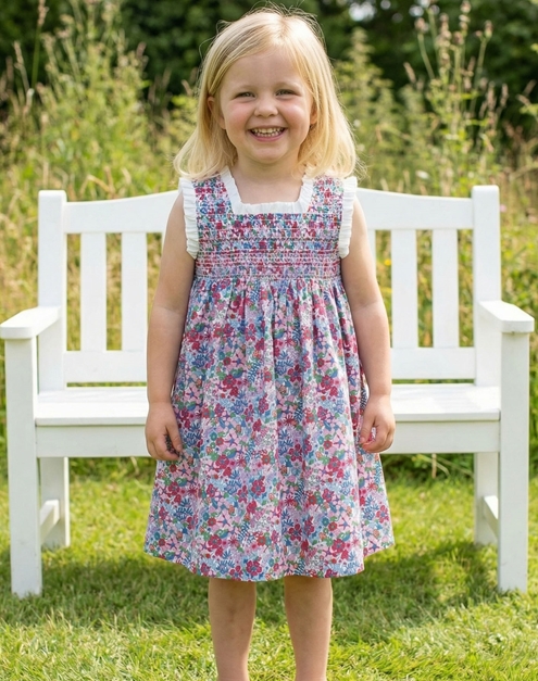 Summer dress with belt loop on the back, smock work in the chest. In a Liberty London print with blues, pinks and fucsia shades. Diaper cover up to 2Y. Made in Spain by m&h