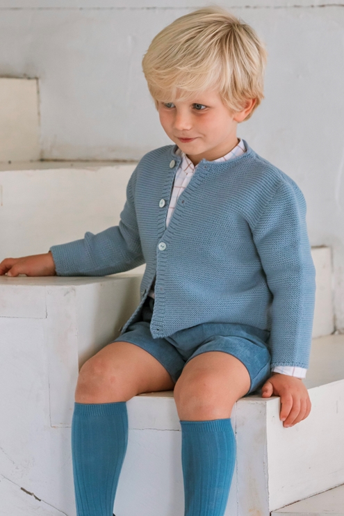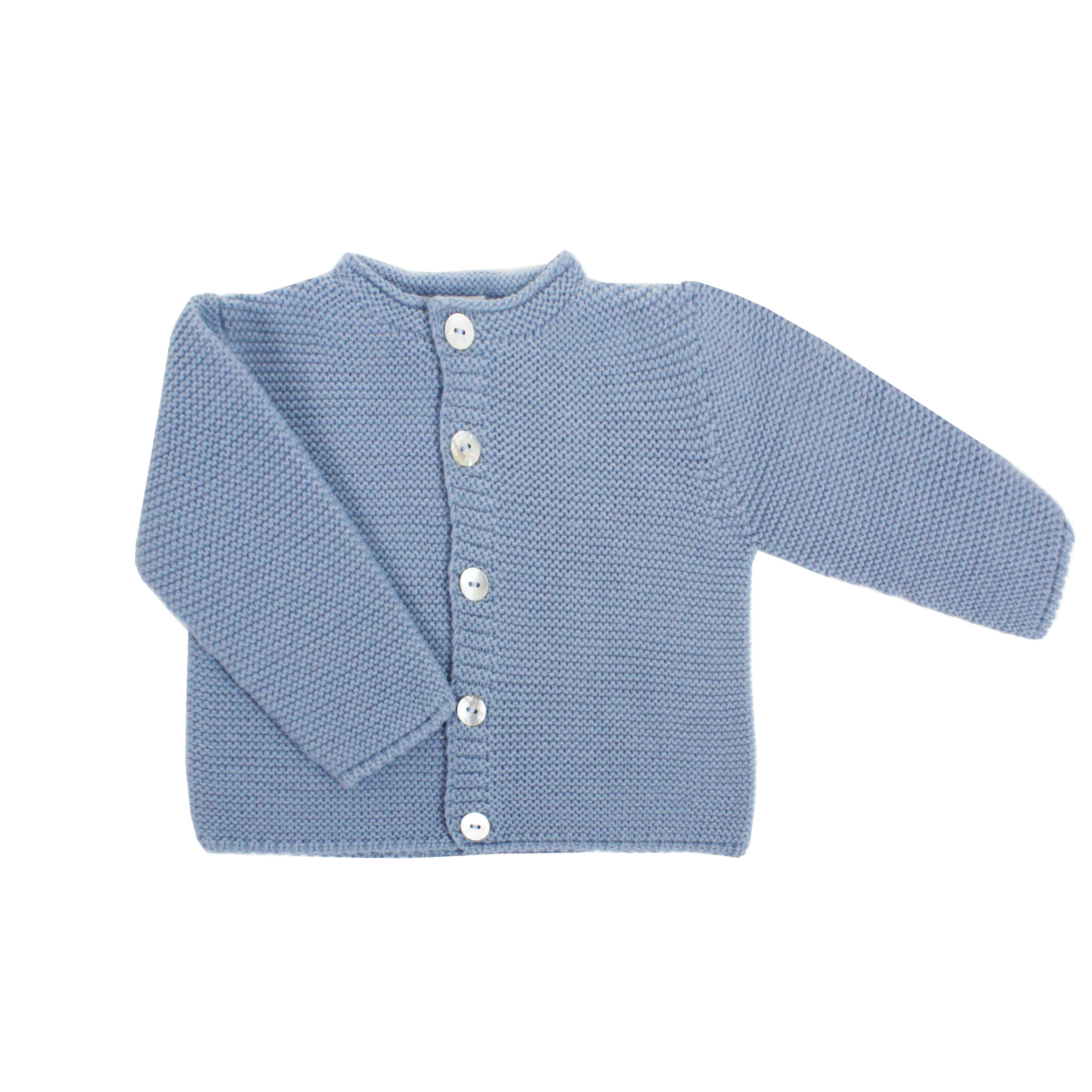 Long buttoned thick knit cardigan in medium blue. Made in Spain by m&h