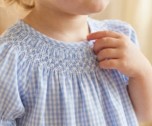 Summer baby dress with short sleeves and neckline with smock, in blue vichy plaid. Made in Spain by m&h. Diaper cover