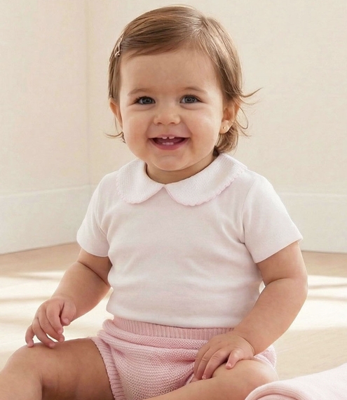 Body manga corta con cuello de piqué ribeteado en rosa. Abrochado debajo.Fabricado en España por Babidu para myhbaby.com.