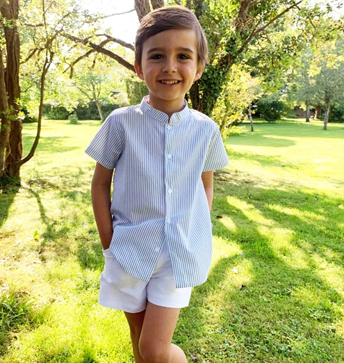 Look bermuda blanca con camisa mao manga corta y rayas verdes.