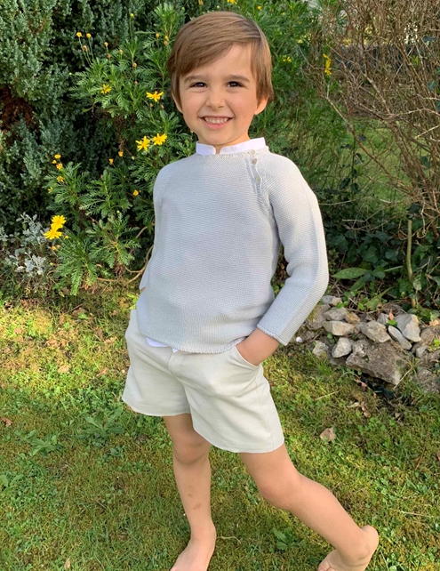 Look bermuda gris perla, camisa mao blanca y jersey en tono gris de punto perlé