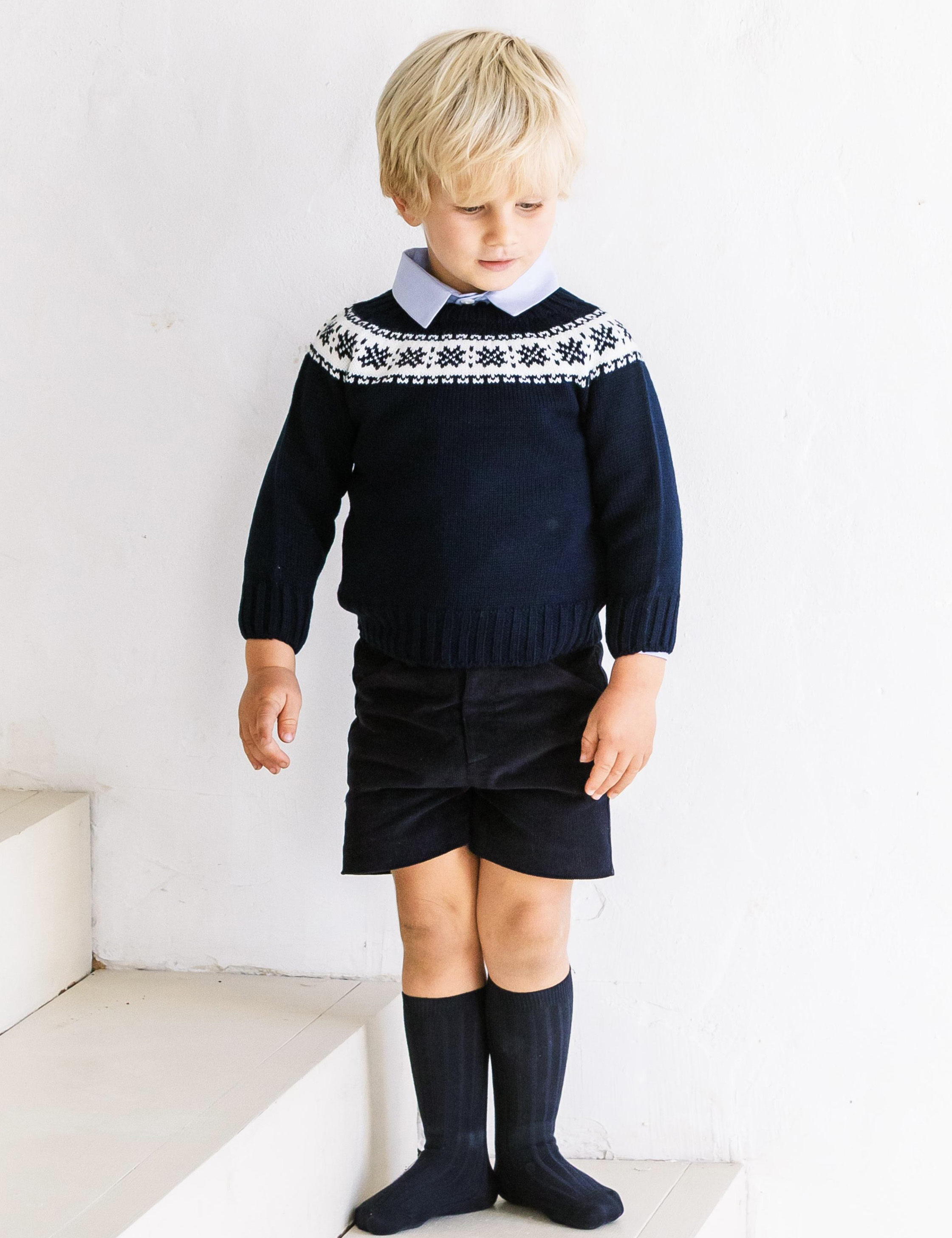 Look de niño con bermuda de pana azul marino, camisa azul con cuello y jersey marino con greca blanca. Trenca a juego en azul marino