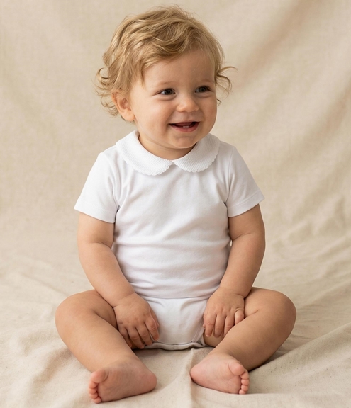 Body manga corta con cuello bebé de piqué ribeteado en blanco. Abotonado debajo. Fabricado en España por Babidú