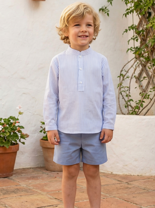 Bermuda de algodón en tono azulón para niño. Con bolsillos a los lados, cierre con doble botón y elástico trasero en cintura.