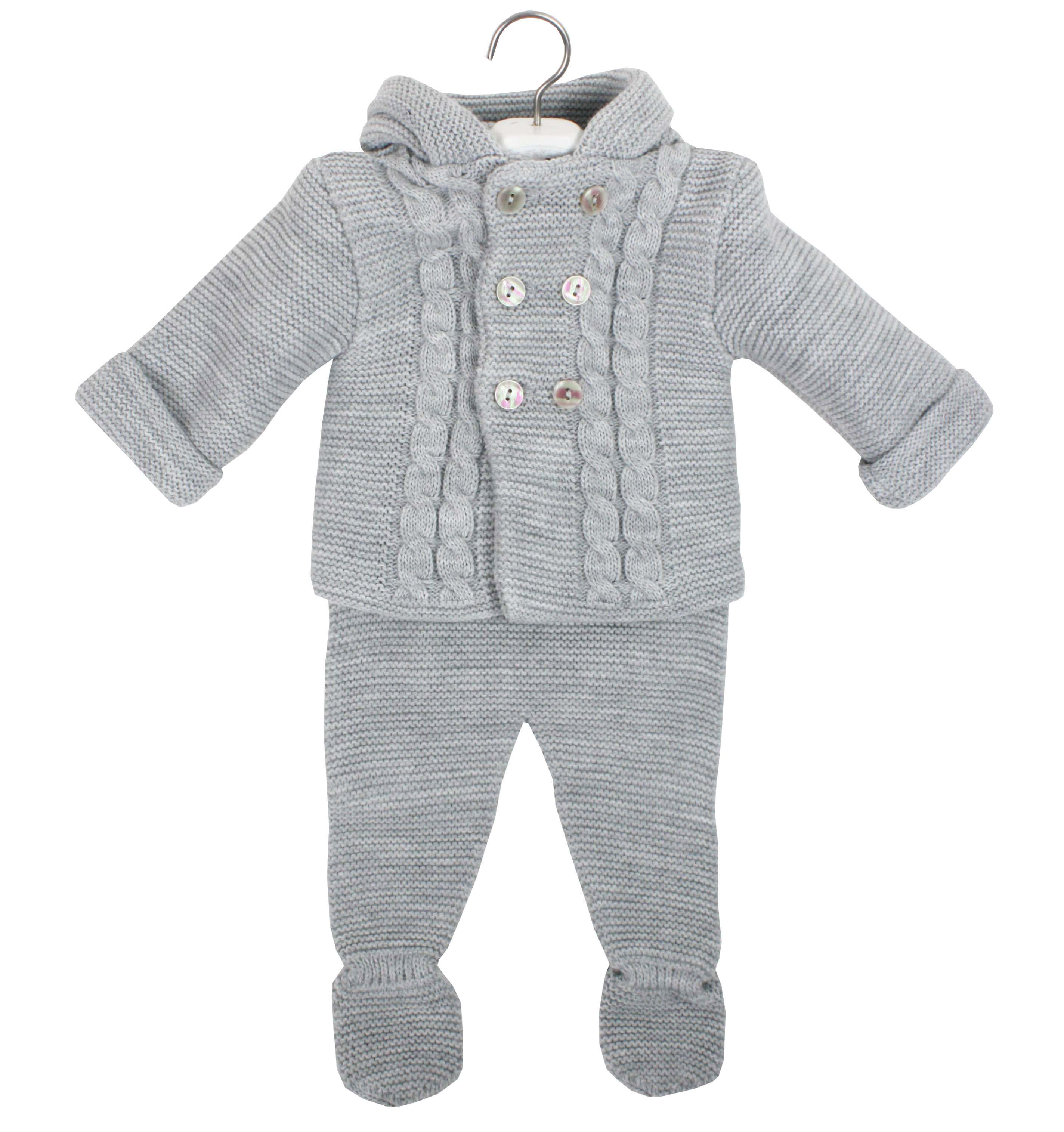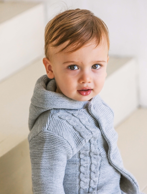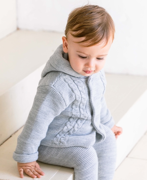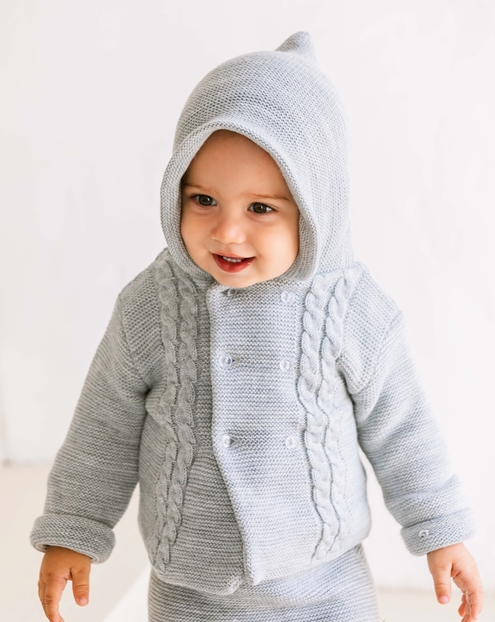 Chaquetón de punto con ohos gris con capucha para bebé. Cierre con doble botonadura al frente. Hecho en España