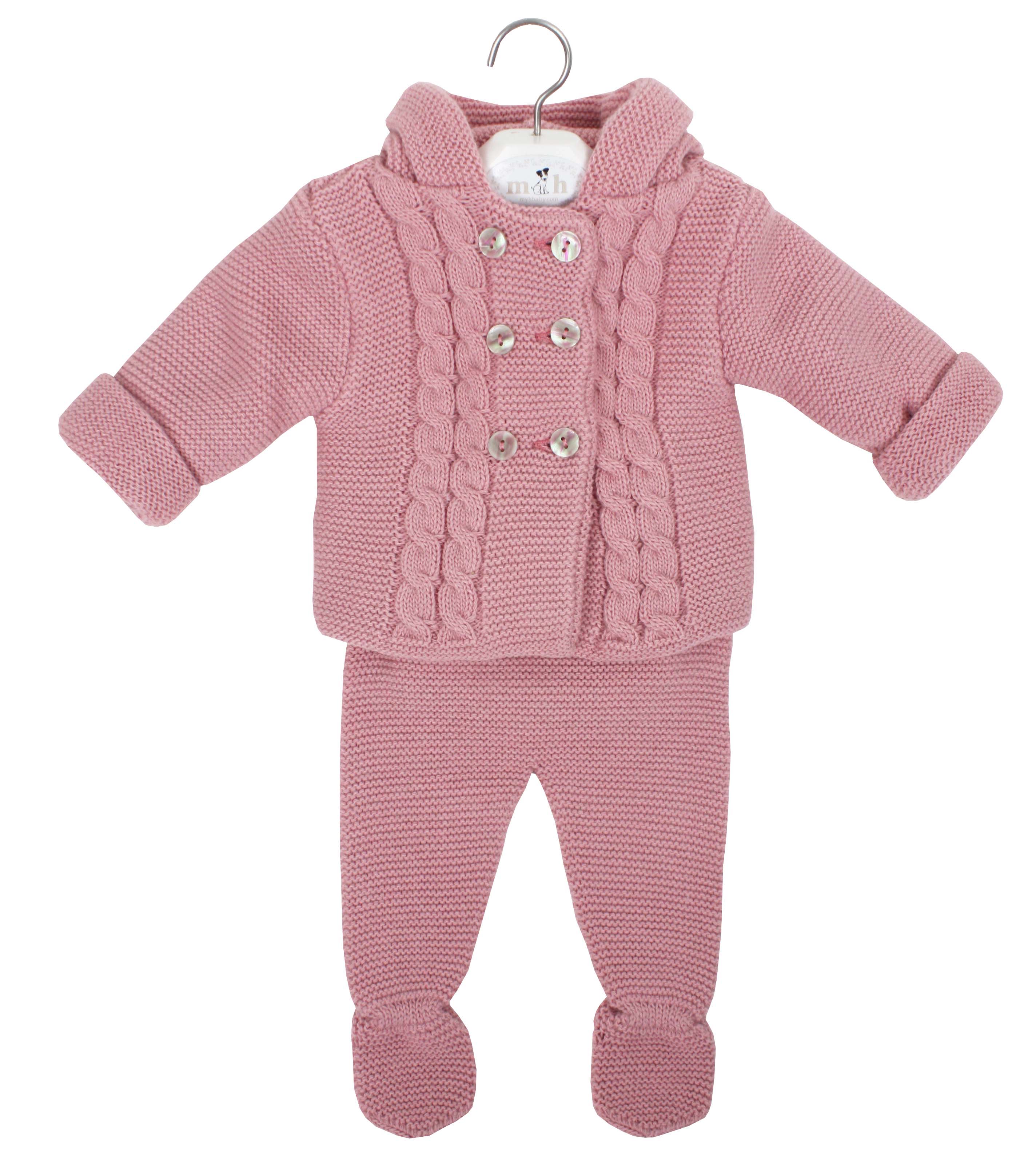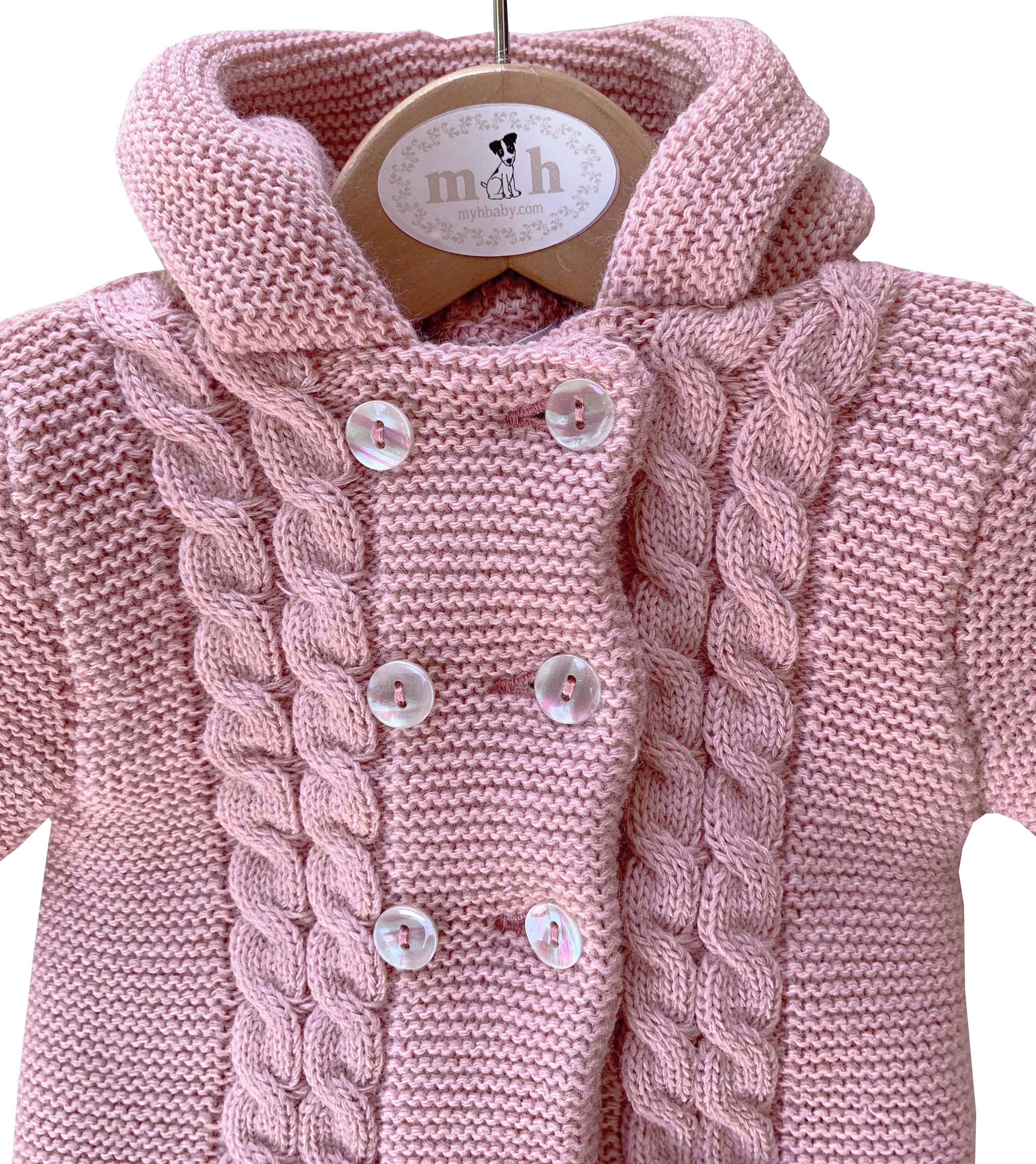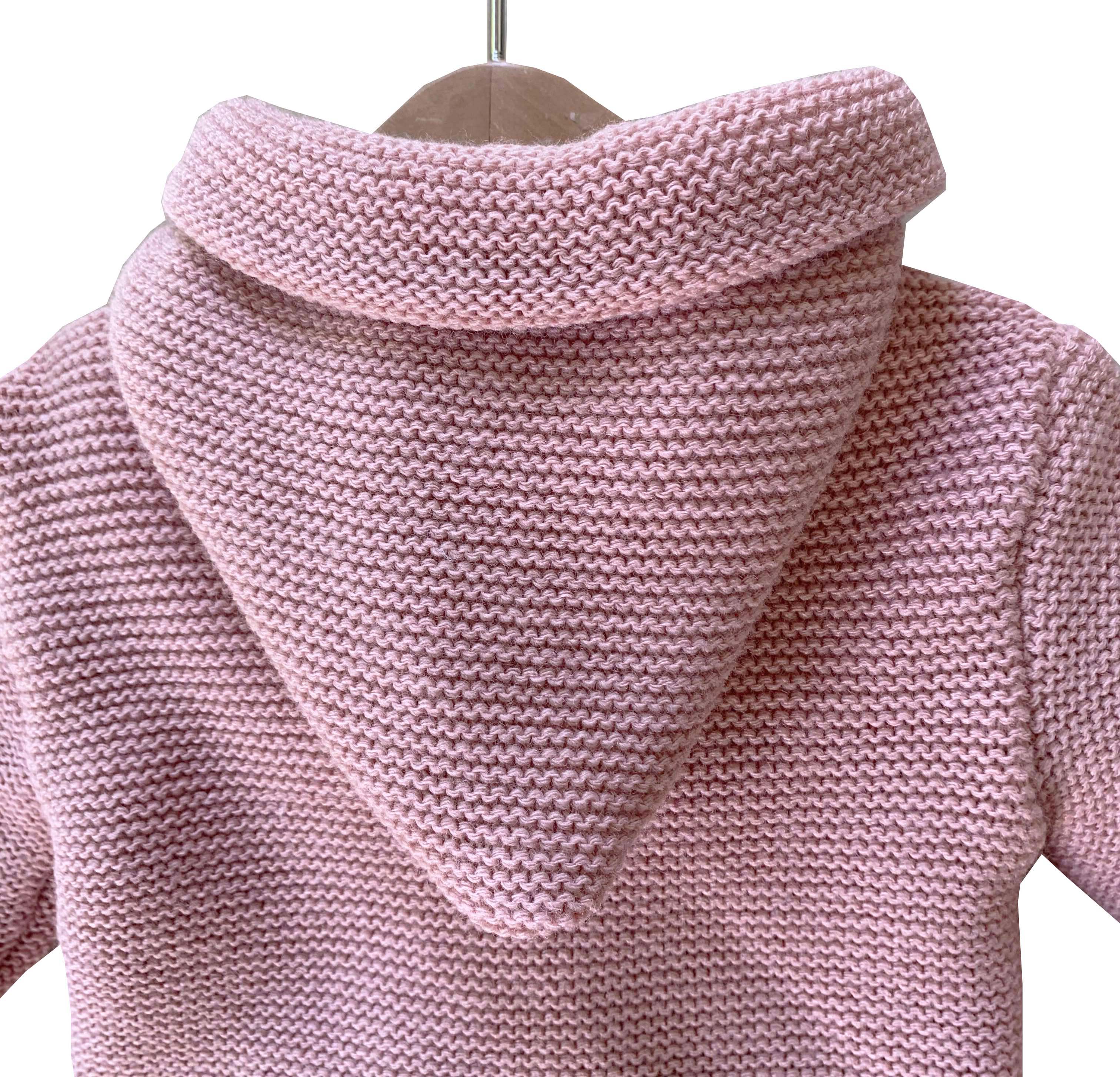 San Francisco de punto con ochos rosa palo. Dos piezas, chaquetón con capucha y polaina a juego. Hecho en España