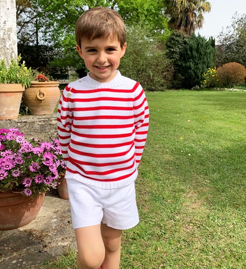 Red striper sweater look, white mao shirt and white linen cotton bermuda