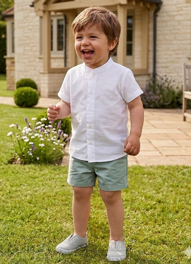Aquamarine green bermuda short for boy. With two buttons on front waist and elastic on back waist.