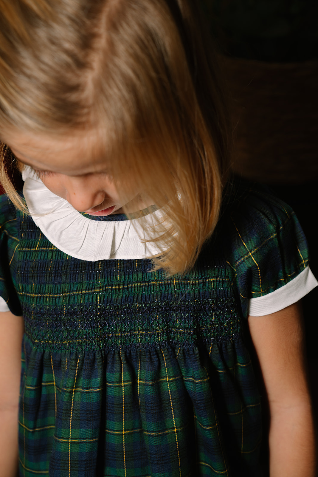 Flavia dress in a green tartan print. Made in Spain by m&h. Diaper cover up to 2Y