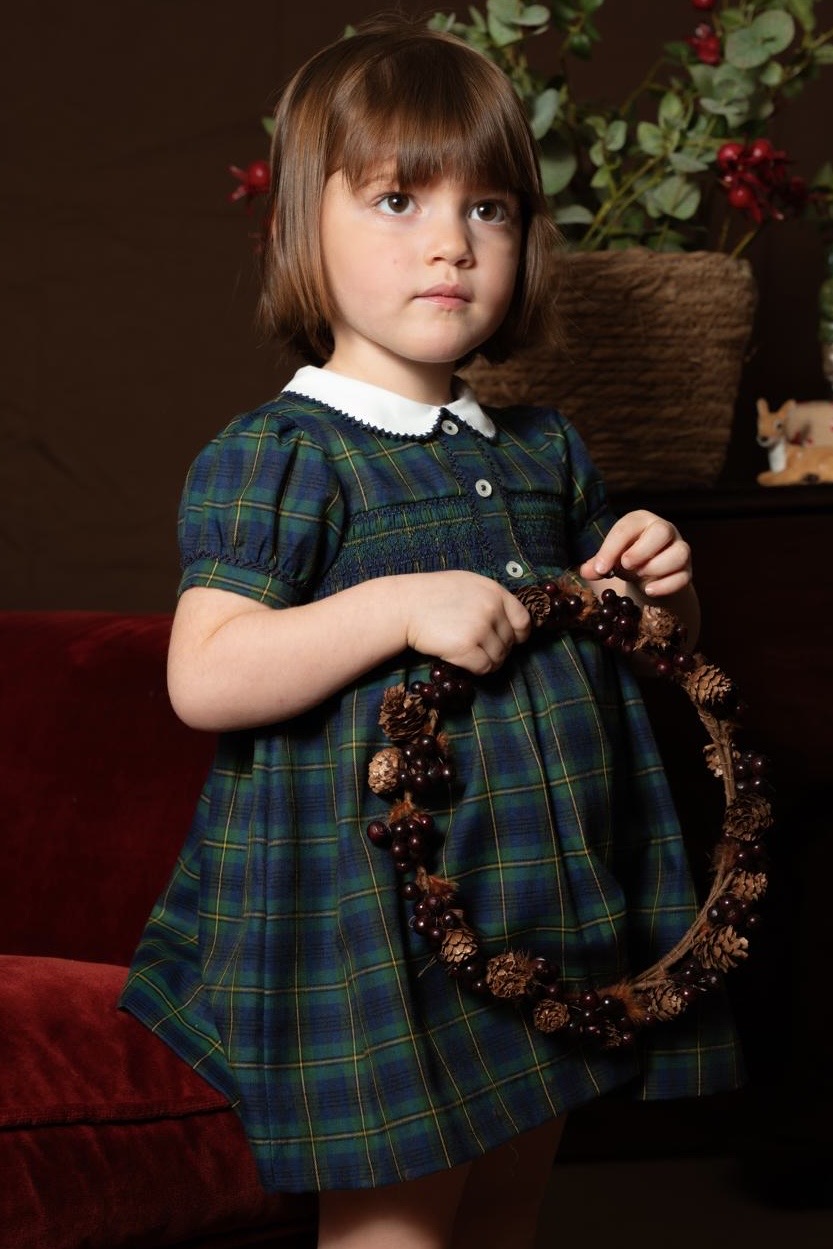 Elisa green tartan dress. With matching diaper cover up to size 24 months. Made in Spain by m&h