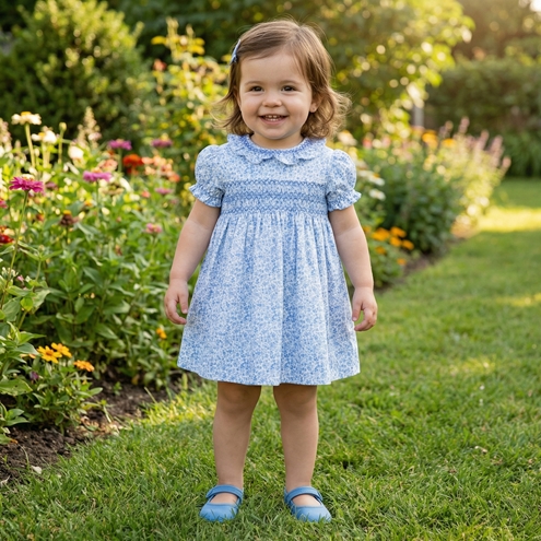 Baby summer dress with short sleeves and smock on the chest, in a blue mini floral print. Diaper cover up to 2Y. Made in Spain by m&h