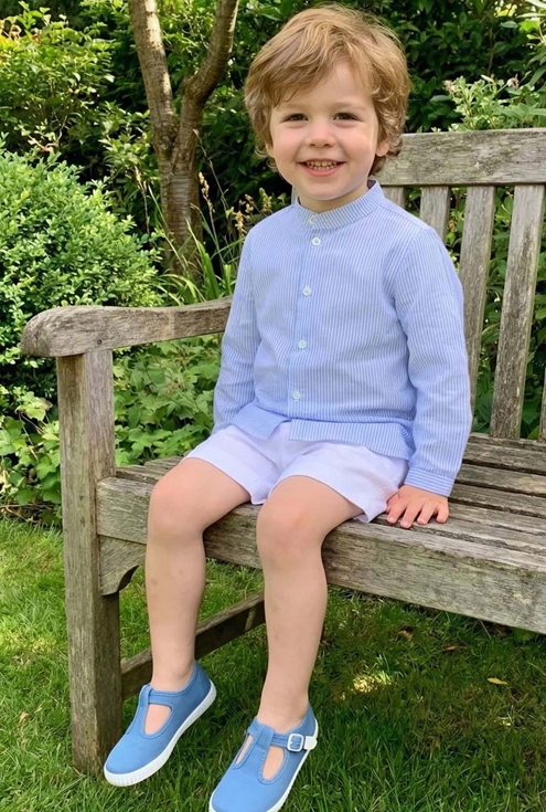 Look camisa mao manga larga rayas azules en lino, con bermuda blanca y lonetas a juego