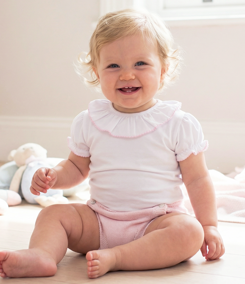 Camiseta blanca de algodón rematada en rosa. Volante de batista. Cierre en la espalda con corchete. Manga corta.