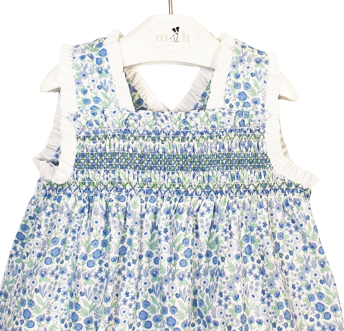 Vestido de verano sin mangas en algodón, flor azul y verde . Hecho en España por m&h. Cubrepañal incluido hasta 2A