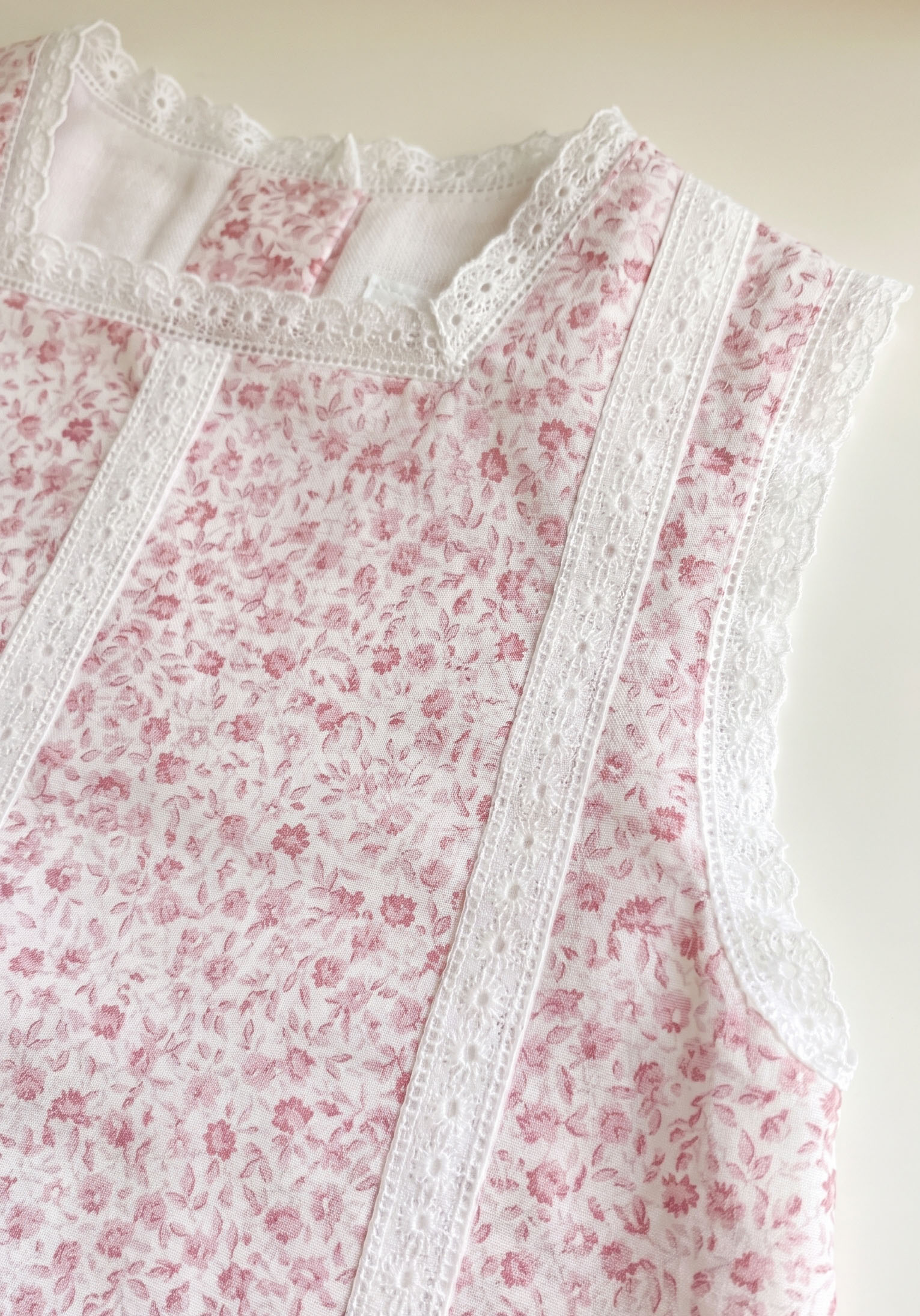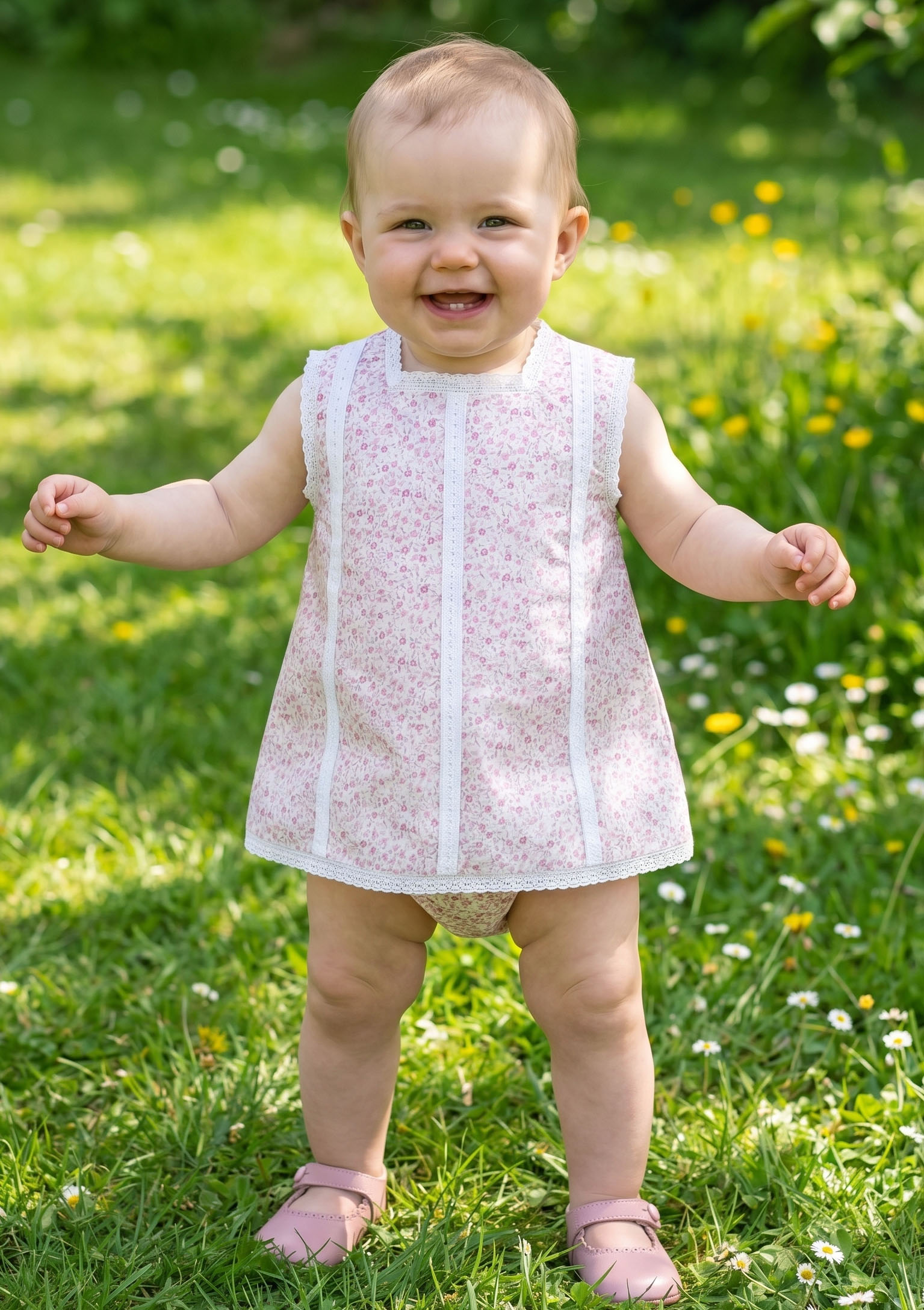 Jesusito de verano en estampado ditsy rosa con detalles de encaje blanco