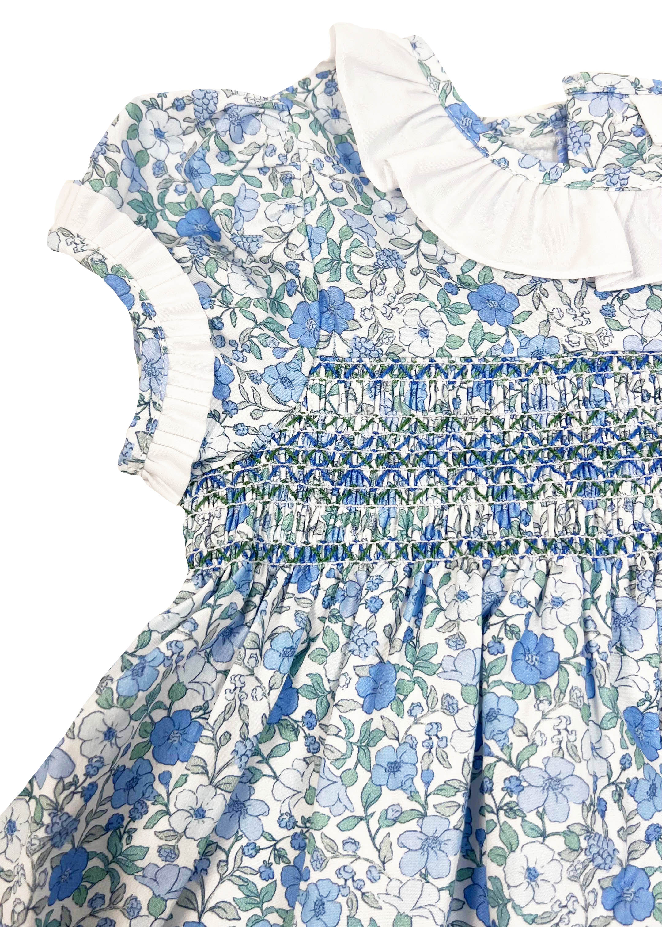 Vestido Valentina flor azul y verde. Incluye pololo a juego hasta 24m. Hecho en España por m&h