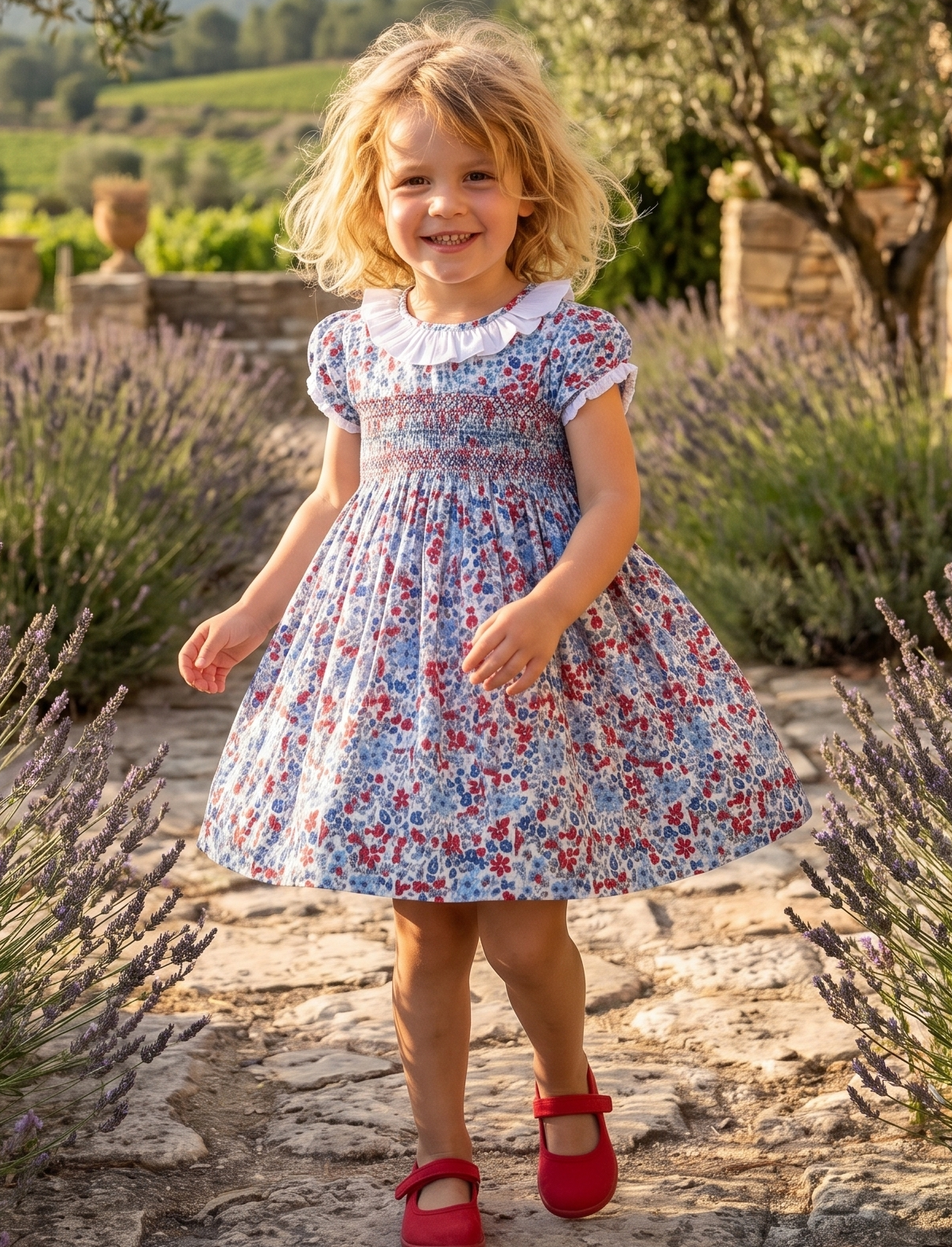 Vestido de verano con cuello volante blanco y nido de abeja en estampado floral rojo y azul